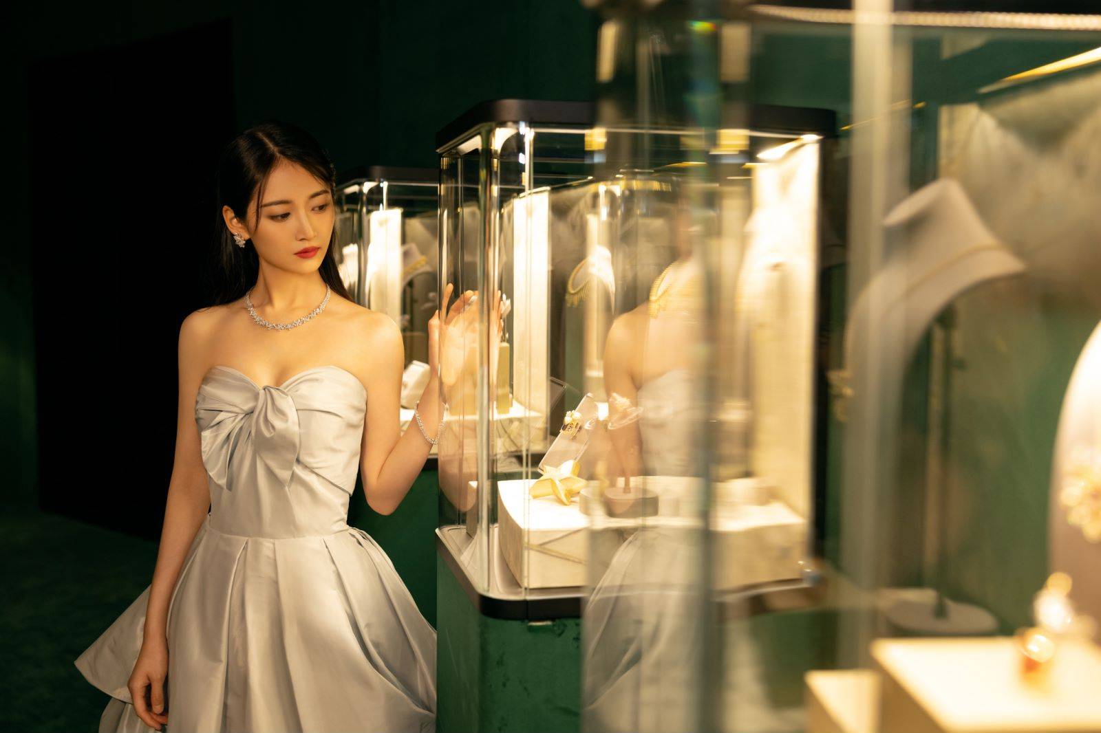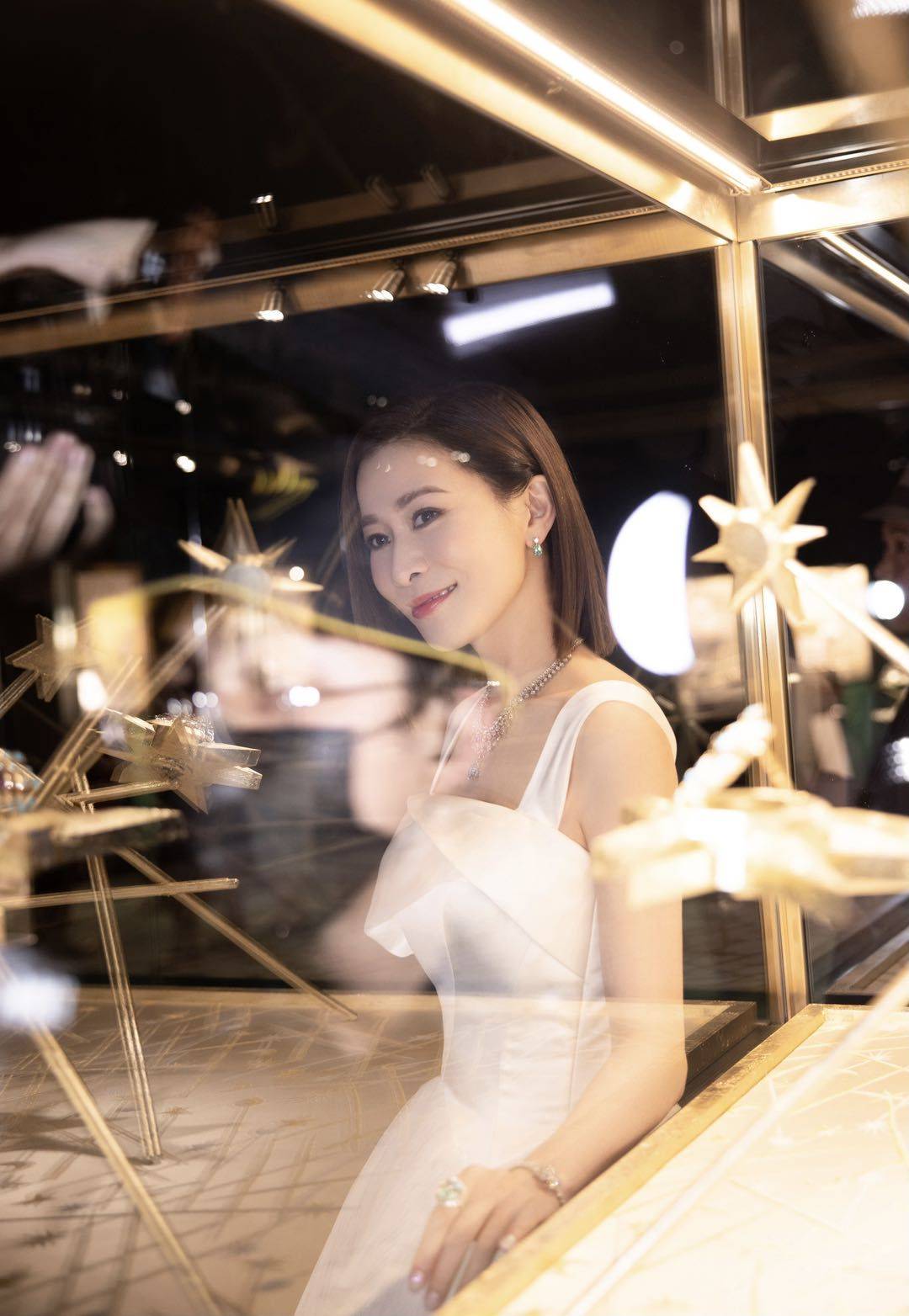 佩戴铂金镶嵌钻石系列珠宝点缀纯白曳地长裙的佘诗曼,走的是曼妙星光与优雅身姿,矜贵优雅的白雪皇后风范,大女主的气场十足。