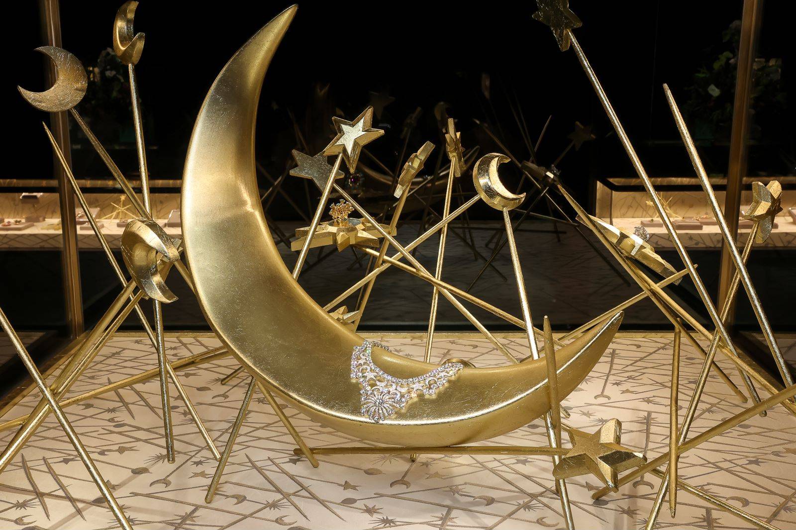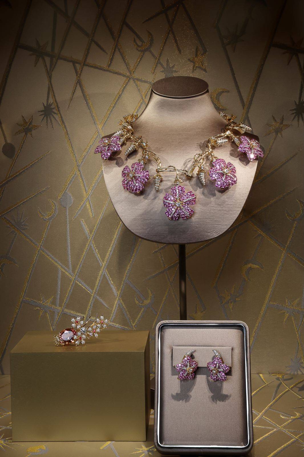 耀目华美的星月项链,在充满艺术气息的橱窗映衬下,一展关于宇宙的炫丽想象。牵牛花造型项链,以粉色蓝宝石与18K黄金材质演绎花朵与藤蔓的蓬勃姿态,彰显出让·史隆伯杰对生命力的敏锐捕捉。