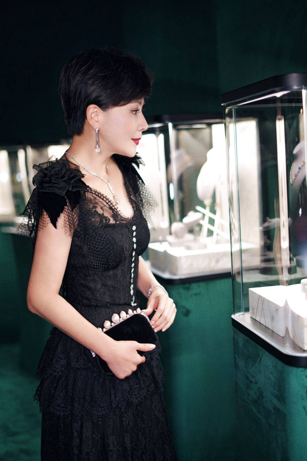 同样逆龄生长的刘嘉玲同样展示出其非凡状态,黑色蕾丝礼服搭配钻石项链,璀璨流光尽显典雅之姿,一袭短发更显其英气十足。